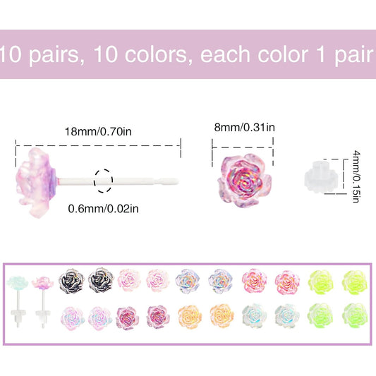10 Pairs 8 mm 3D Plastic Resin Rose Stud Earrings Transparent Illusion Colored Earring Posts with Clear Earring Backs for Women Teens Sensitive Ears Sports Party Replacement