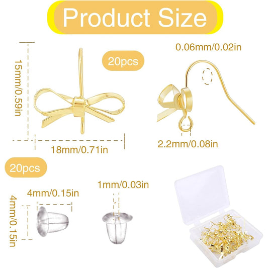 1 Box of 20pcs Bowknot Earring Hooks with Hole 14K Golden Plated Alloy Bow Dangle Earrings Findings and 20pcs Clear Earring Safety Backs for Women DIY Crafts Jewelry Making Supplies