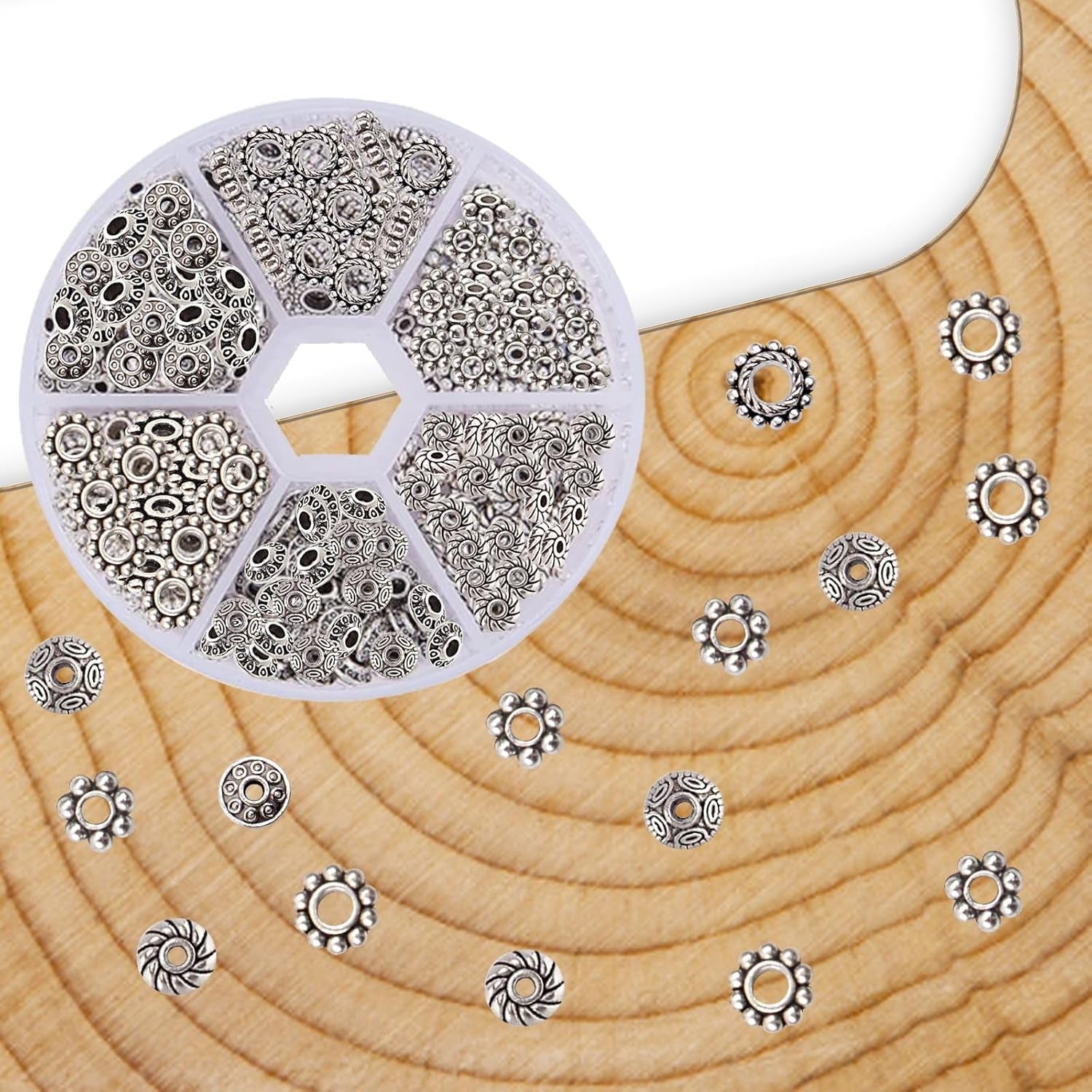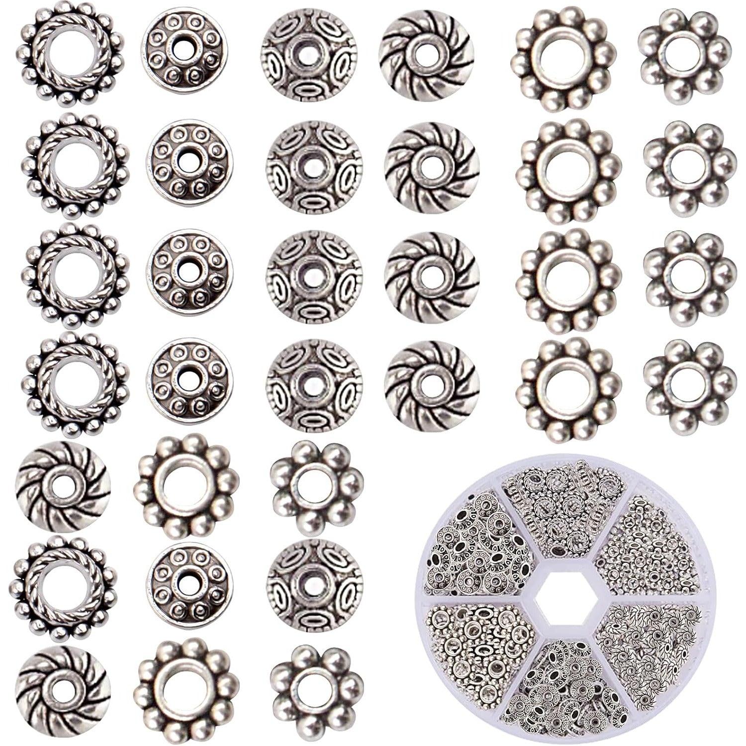 1 Box 300pcs 6 Styles Antique Silver Spacer Beads Tibetan Alloy Flower Charm Loose Bead Small Flat Round Rondelle Spacers Bulk for DIY Crafts Bracelets Earrings Jewelry Making