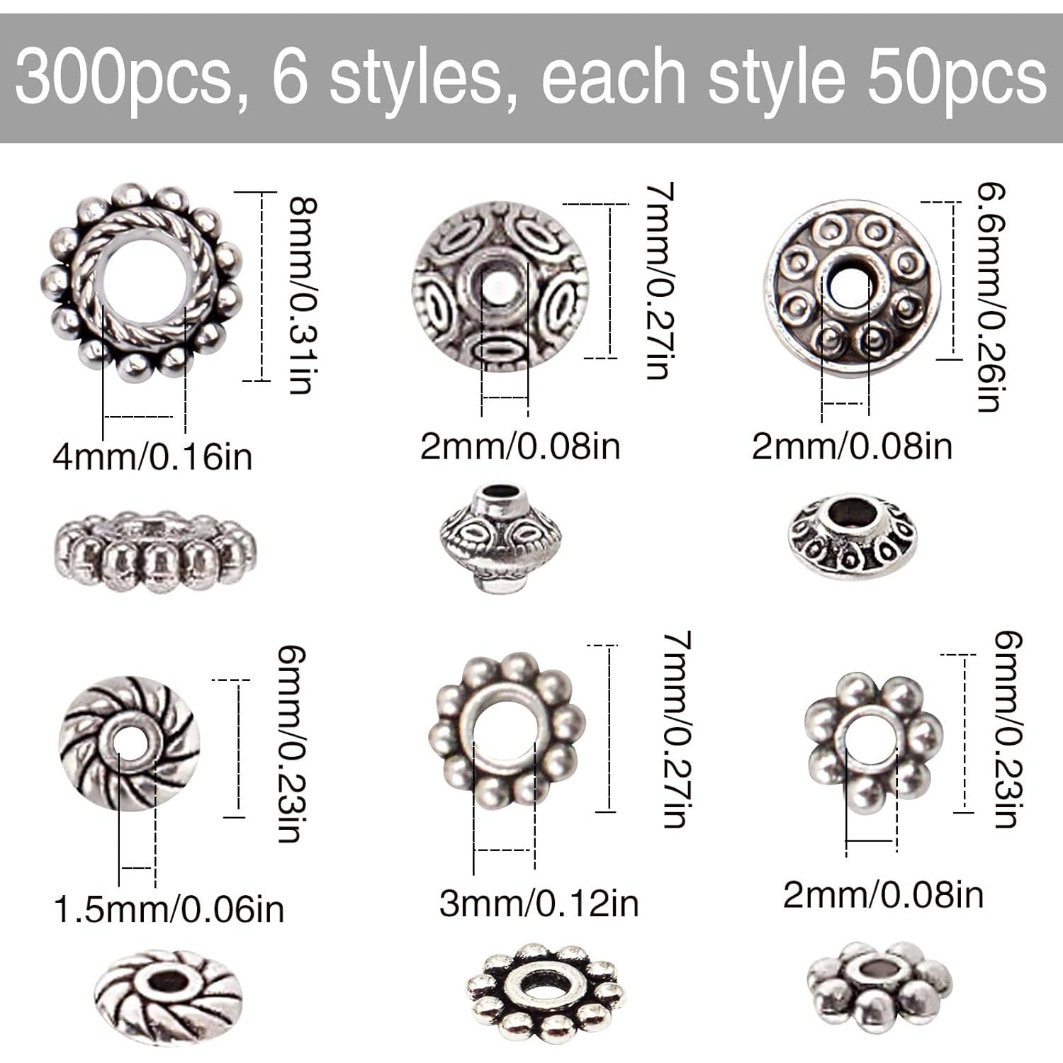 300pcs Antique Silver Spacer Beads with a box(6 styles, each style 50pcs)