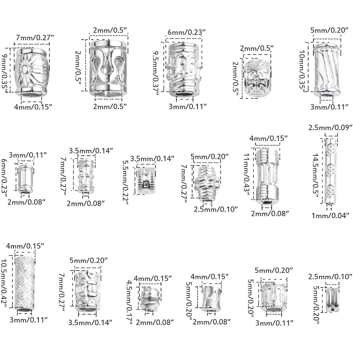 100 Gram Mixed Column Barrel Spacer Beads Vintage Alloy Tube Bar Shape Loose Charm Beads Accessories for DIY Bracelet Necklace Jewelry Making Findings, Bright Silver