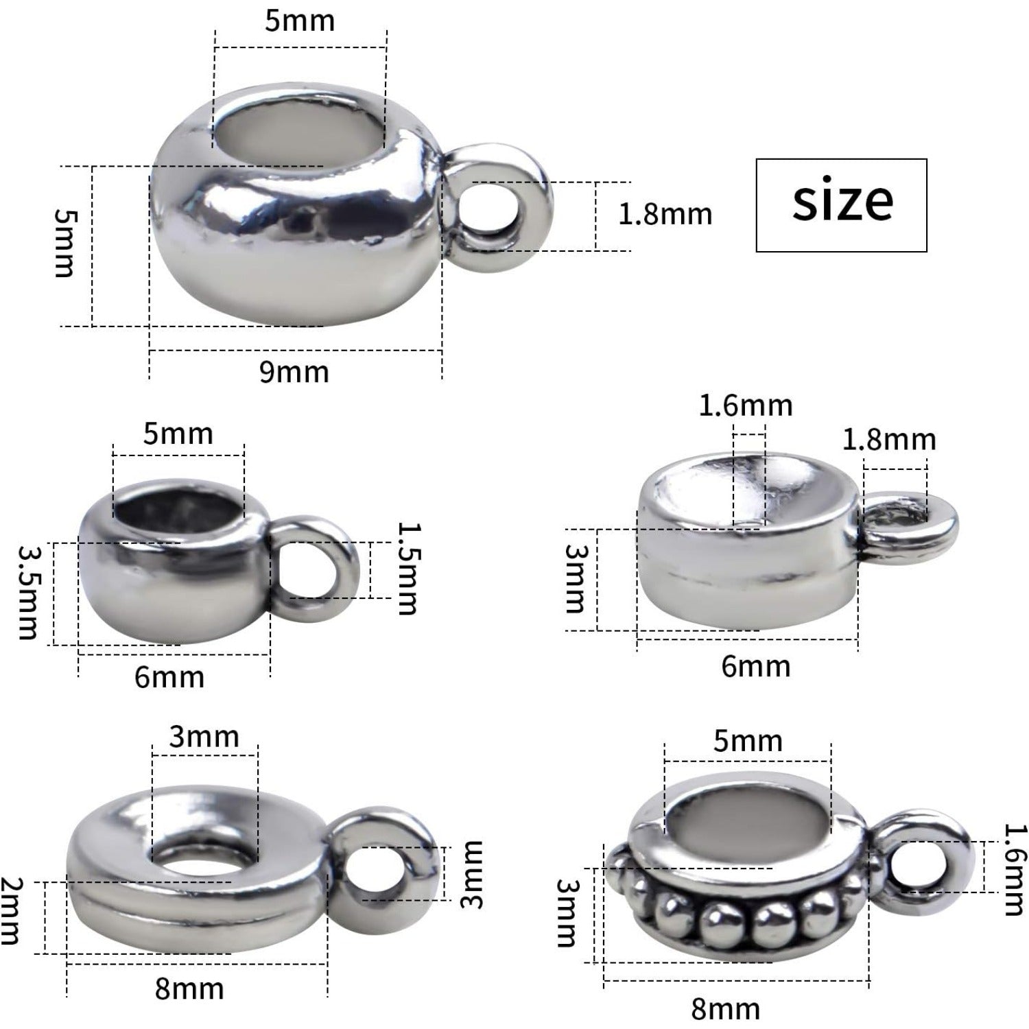 Specification Material: alloy Color: silver Size: 3-27mm Hole Size: 1.5-6mm Quantity: 100g Package Content 100g (about 100-150pcs) Connector Bail Beads
