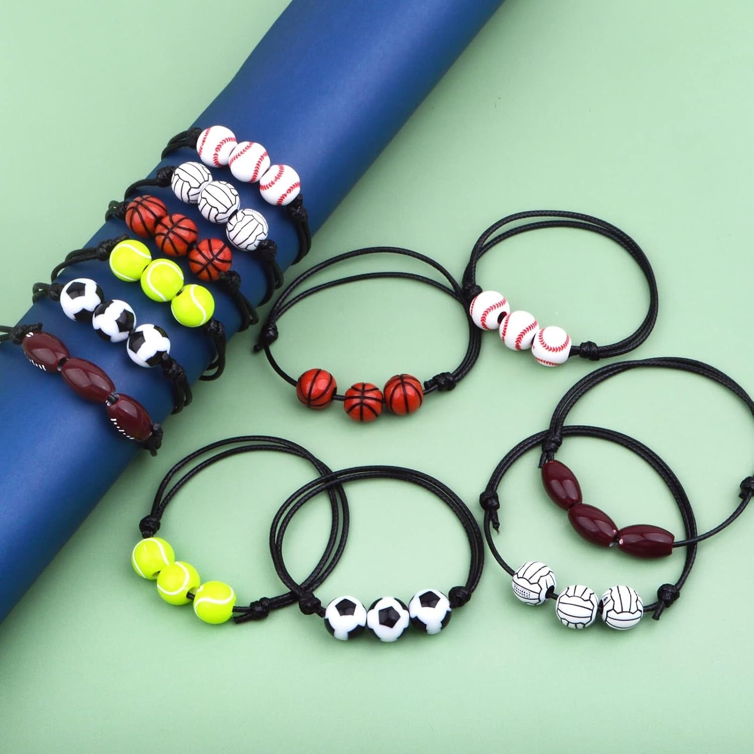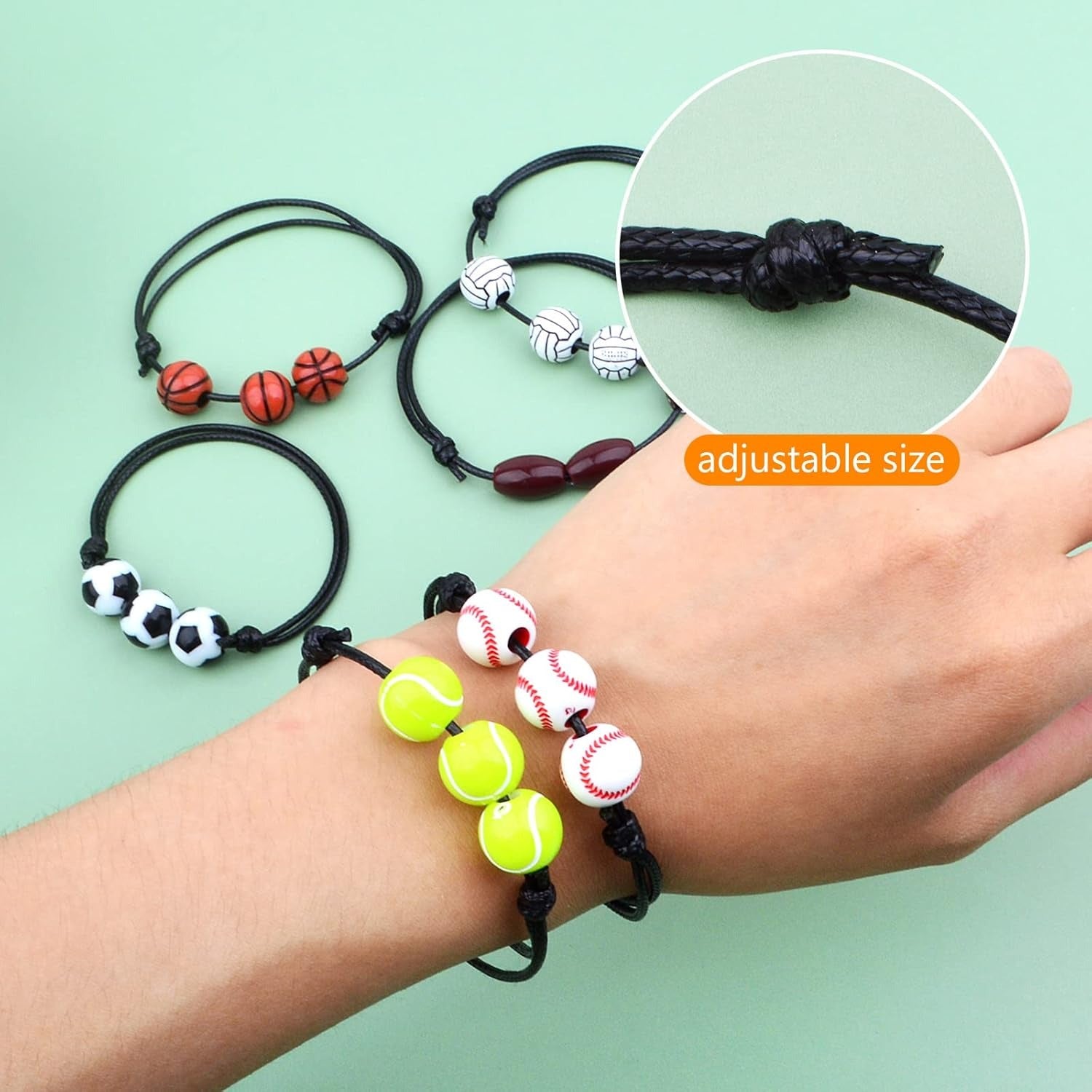 12pcs Adjustable Sport Theme Ball Charm Bracelets Soccer Basketball Baseball Volleyball Tennis Rugby Bracelet Wristbands Friendship for Teens Students Sport Team Players, 6 Styles