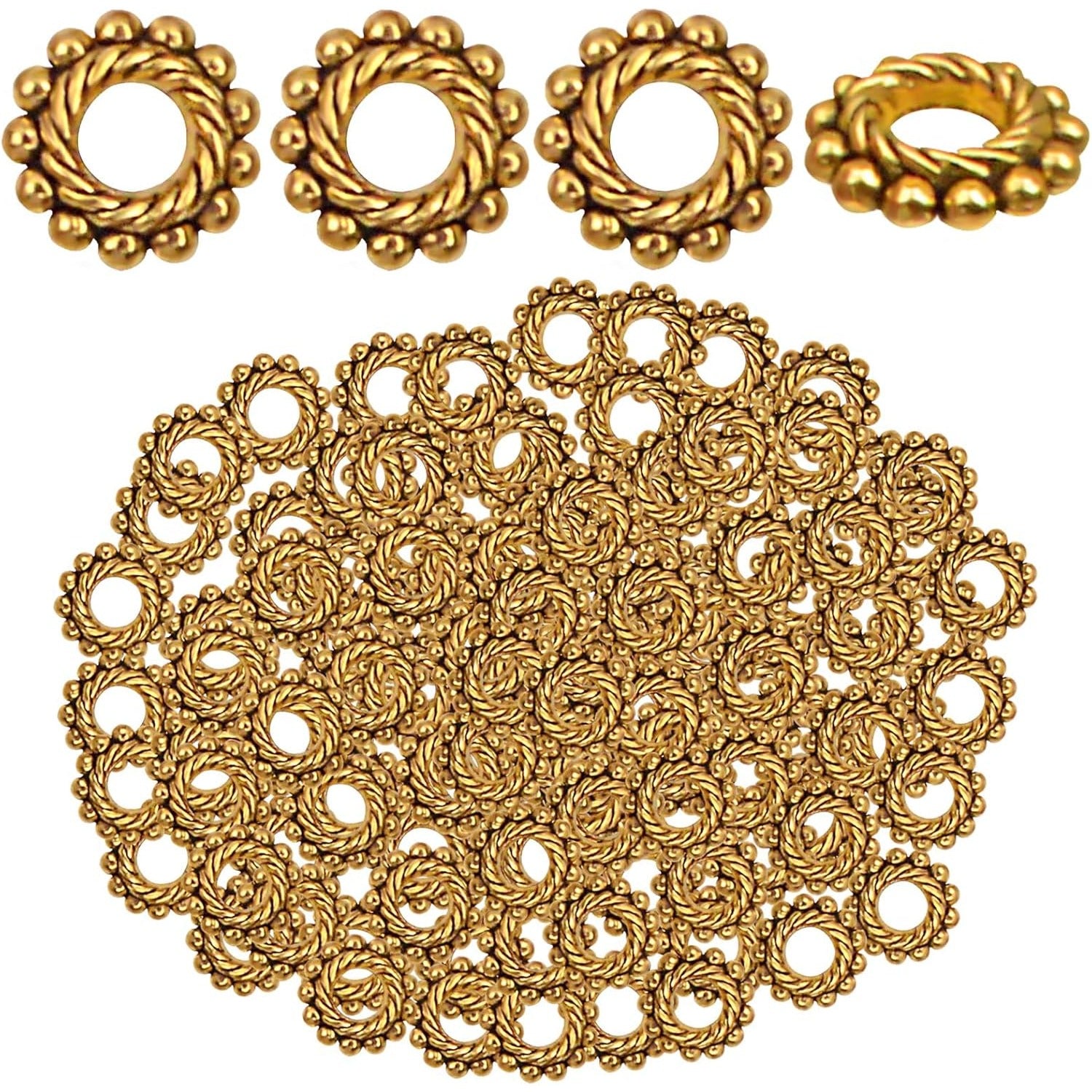 200pcs Round Gear Spacer Beads Tibetan Antique Golden Alloy Rondelle Loose Charm Bead Metal Spacers Accessories for DIY Bracelet Necklace Earrings Crafts Jewelry Findings