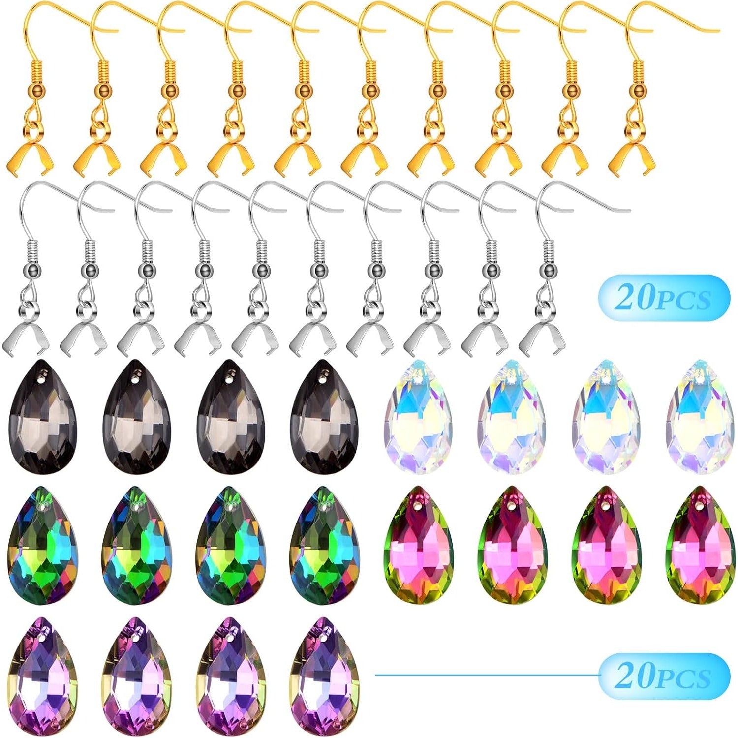 20pcs Hypoallergenic Earring Hooks Stainless Steel French Earwire Ear Ball Hooks with Pinch Bail Clasps and 20pcs Colorful Teardrop Crystal Pendants for DIY Earring Jewelry Making
