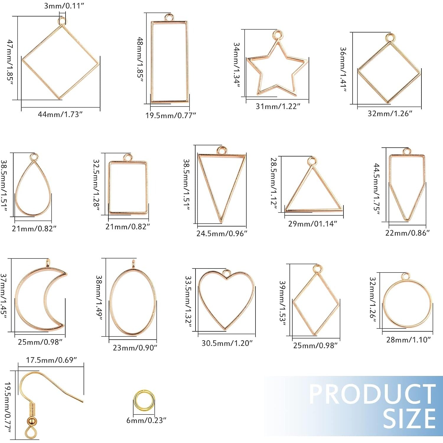 28pcs 14 Styles Hollow Frame Pendants Resin Craft Open Bezels Pendants Molds and 28pcs Earring Hooks with 28pcs Open Jump Rings for Resin Casting Earrings Jewelry Making Supplies