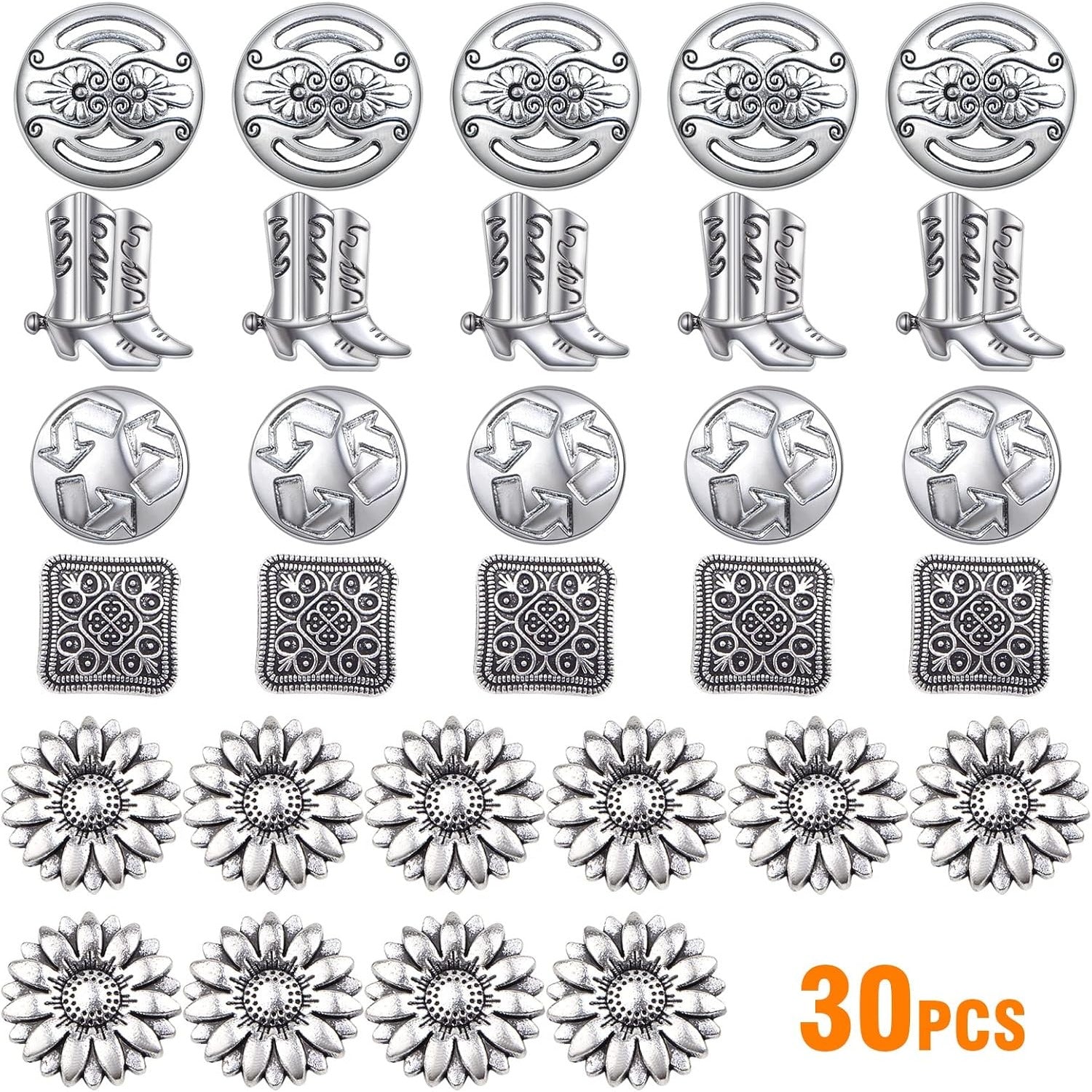 30pcs Silver Sewing Shank Buttons Tibetan Alloy Assorted Carved Sunflower Arrowhead Boot Decorative Handmade Buttons for Costumes Design Clothes Jeans Sewing Crafts, 5 Styles