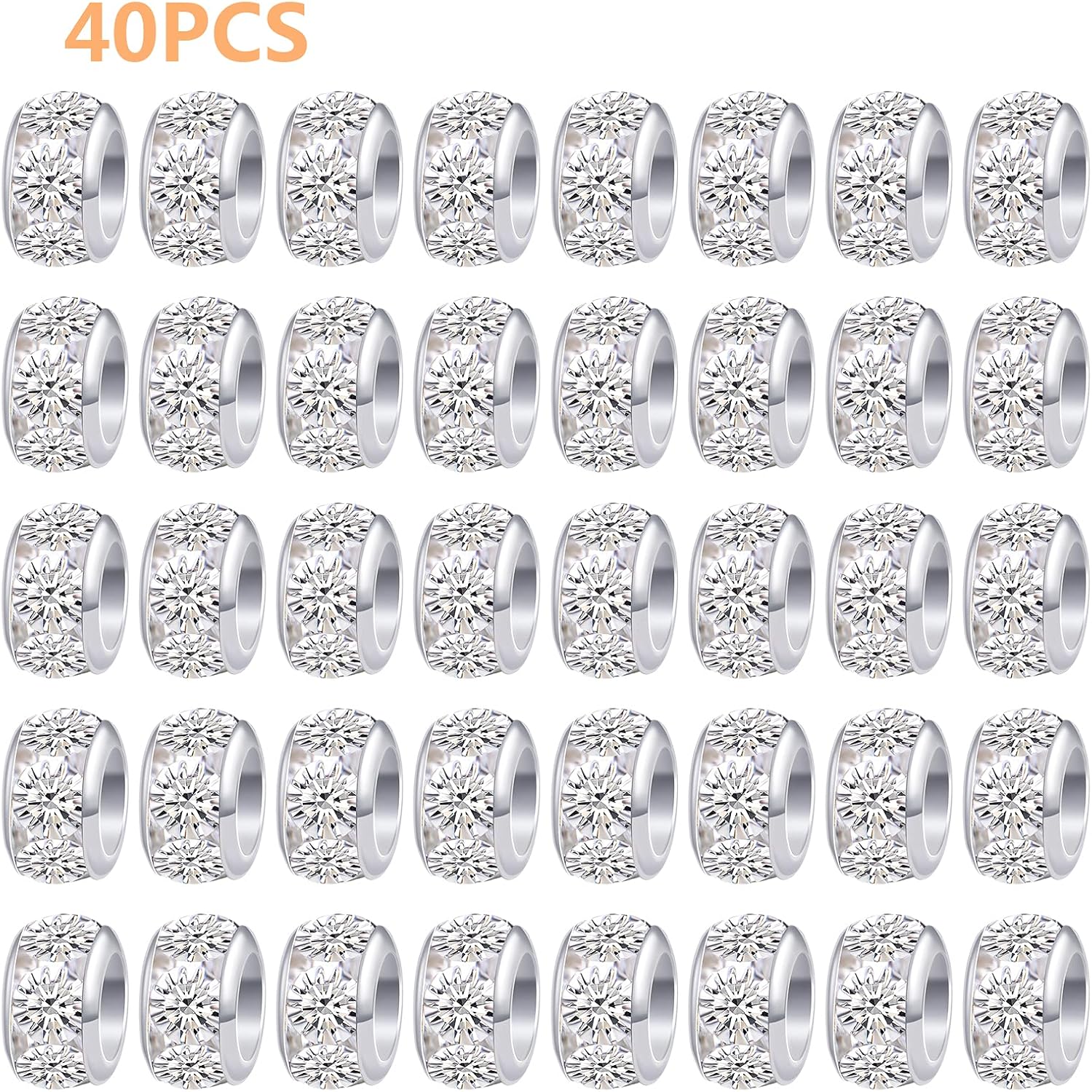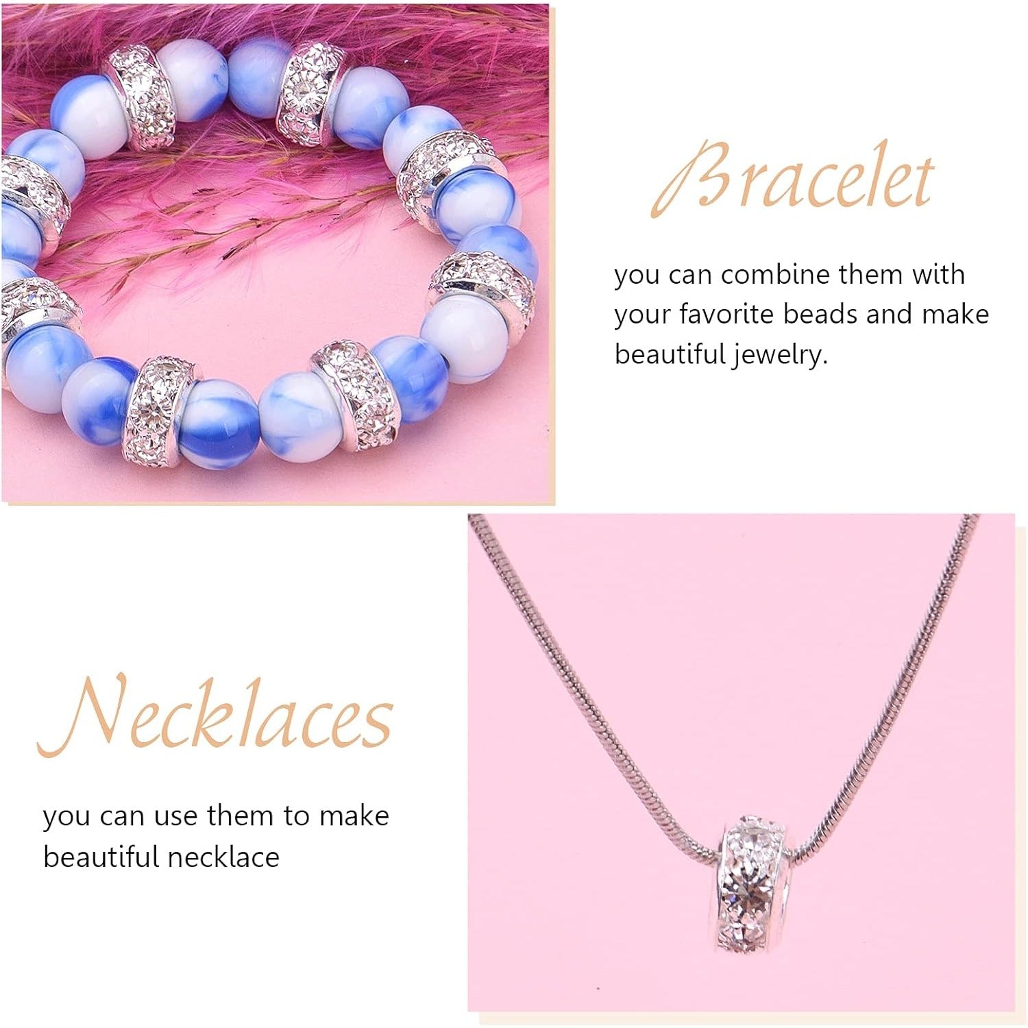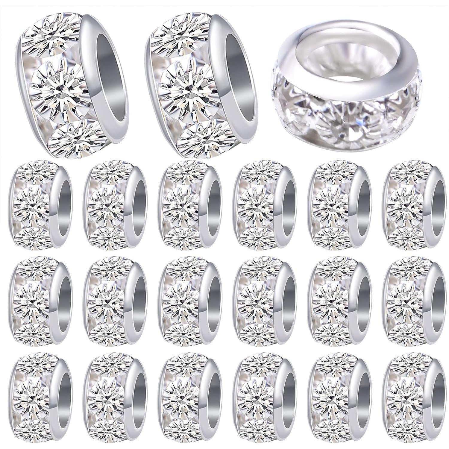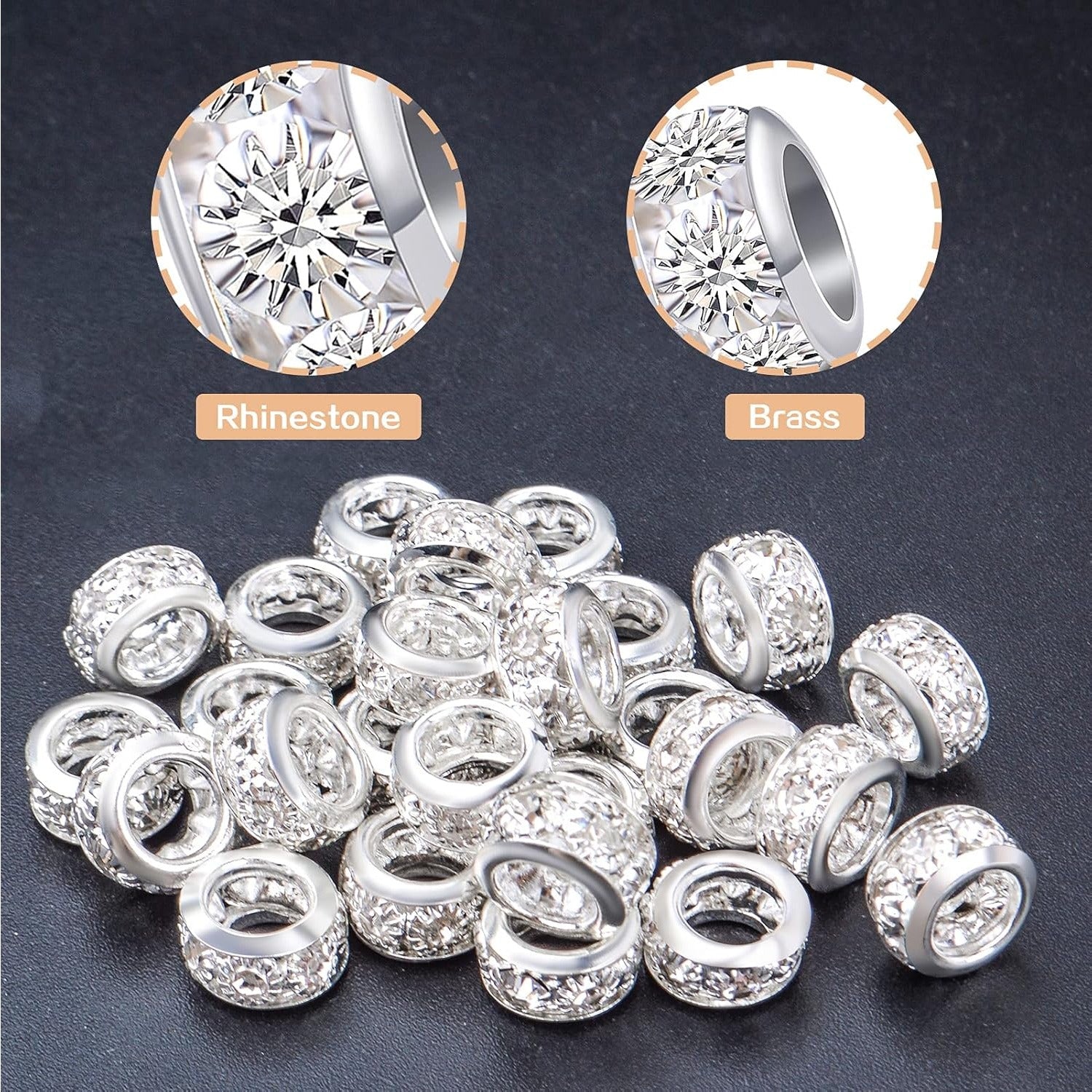 40pcs 10 mm Silver European Rhinestone Spacer Beads Brass Large Hole Beads Round Rondelle Loose Charm Beads for Snake Chain Bracelet necklace Jewelry Making Supplies, Hole: 5.5 mm