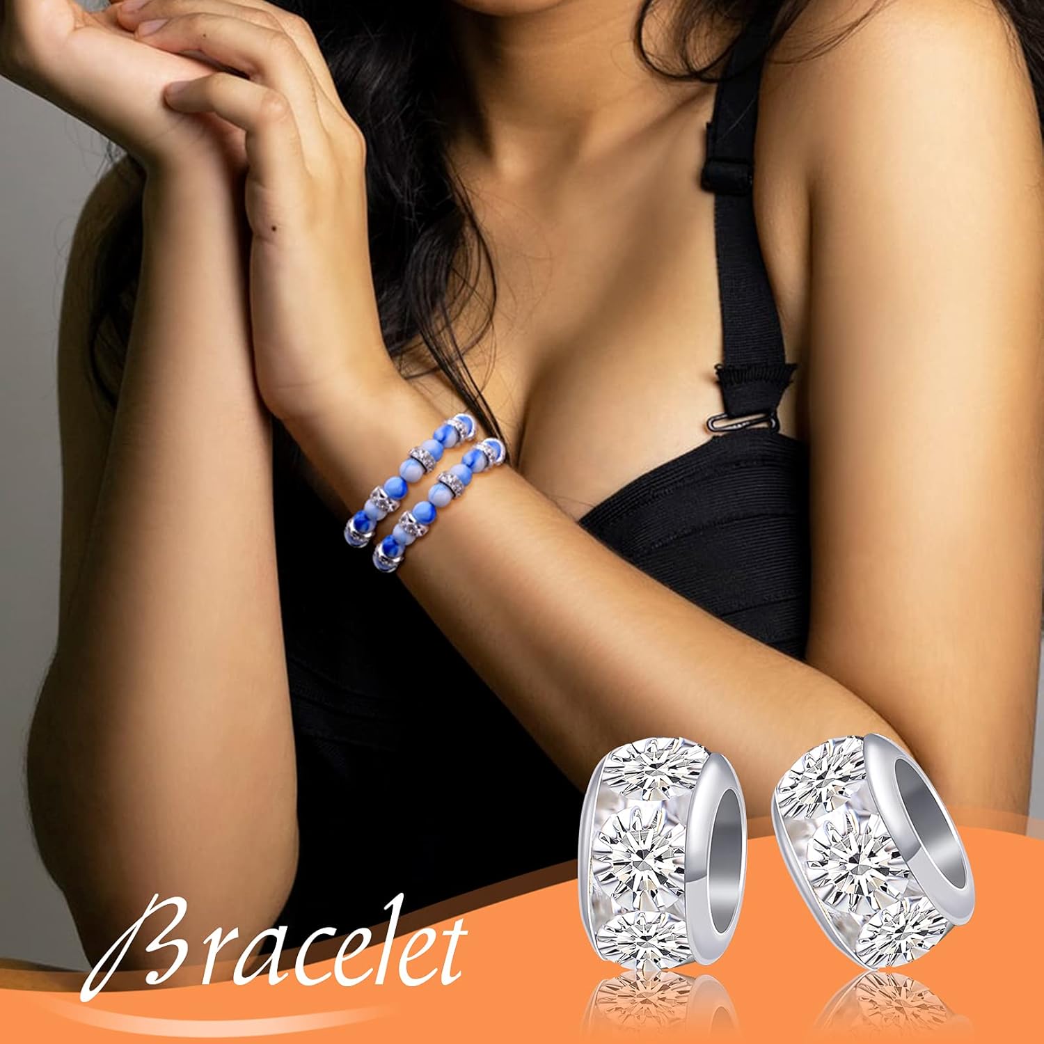 40pcs 10 mm Silver European Rhinestone Spacer Beads Brass Large Hole Beads Round Rondelle Loose Charm Beads for Snake Chain Bracelet Necklace Jewelry Making Supplies, Hole: 5.5 mm