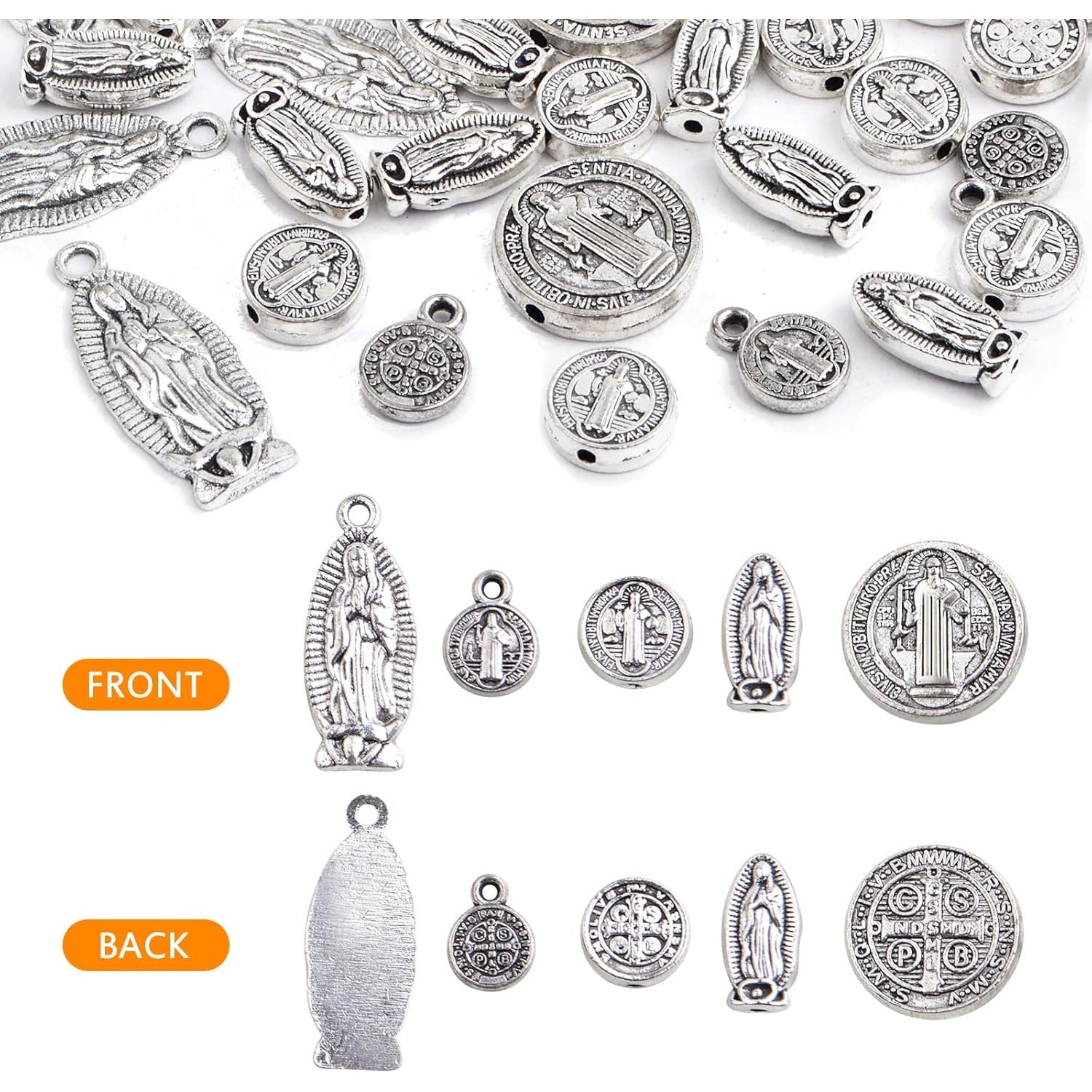 50pcs Antique Silver Mixed Jesus Virgin Mary Religious Benedict Medallion Spacer Beads and Pendant Charms for DIY Rosary Necklace Bracelet Jewelry Making, 5 Styles