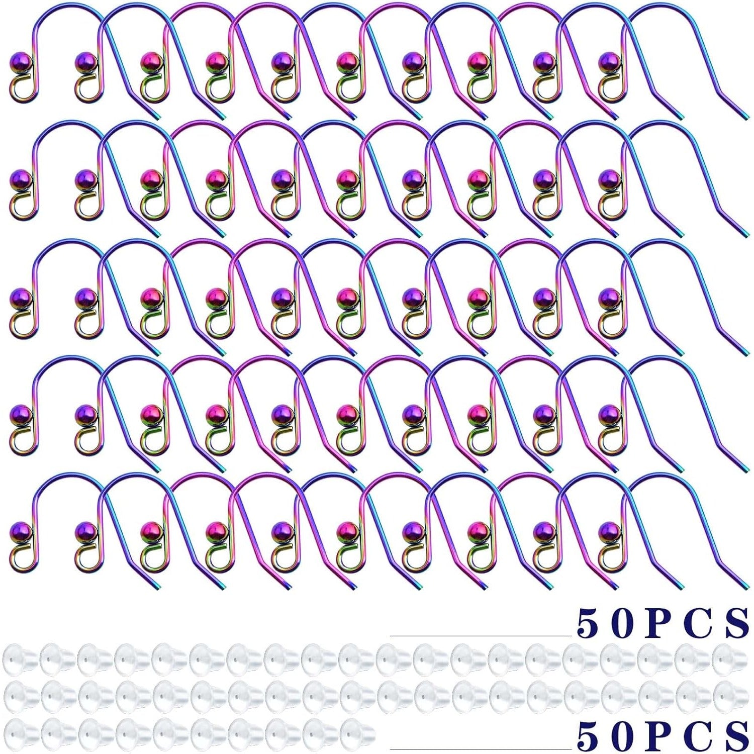 50pcs Rainbow Color Stainless Steel Earring Hooks Hypo-allergenic Ear Wires Fish Hooks with 50pcs Clear Bullet Earring Backs for DIY Dangle Earrings Jewelry Making