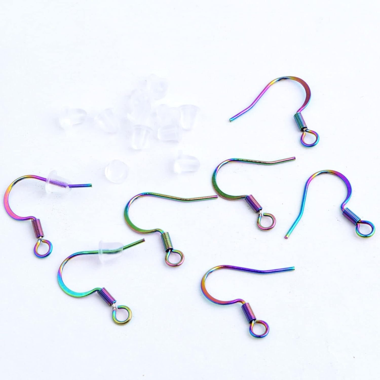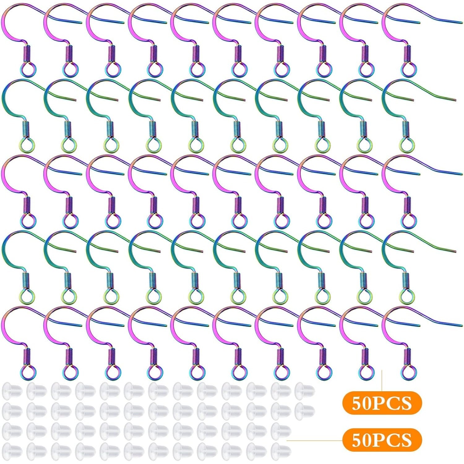 50pcs Stainless Steel Earring Hooks Hypoallergenic French Ear Wire Fish Hooks with 50pcs Clear Earring Safety Backs for DIY Earrings Jewelry Making Supplies, Rainbow Color