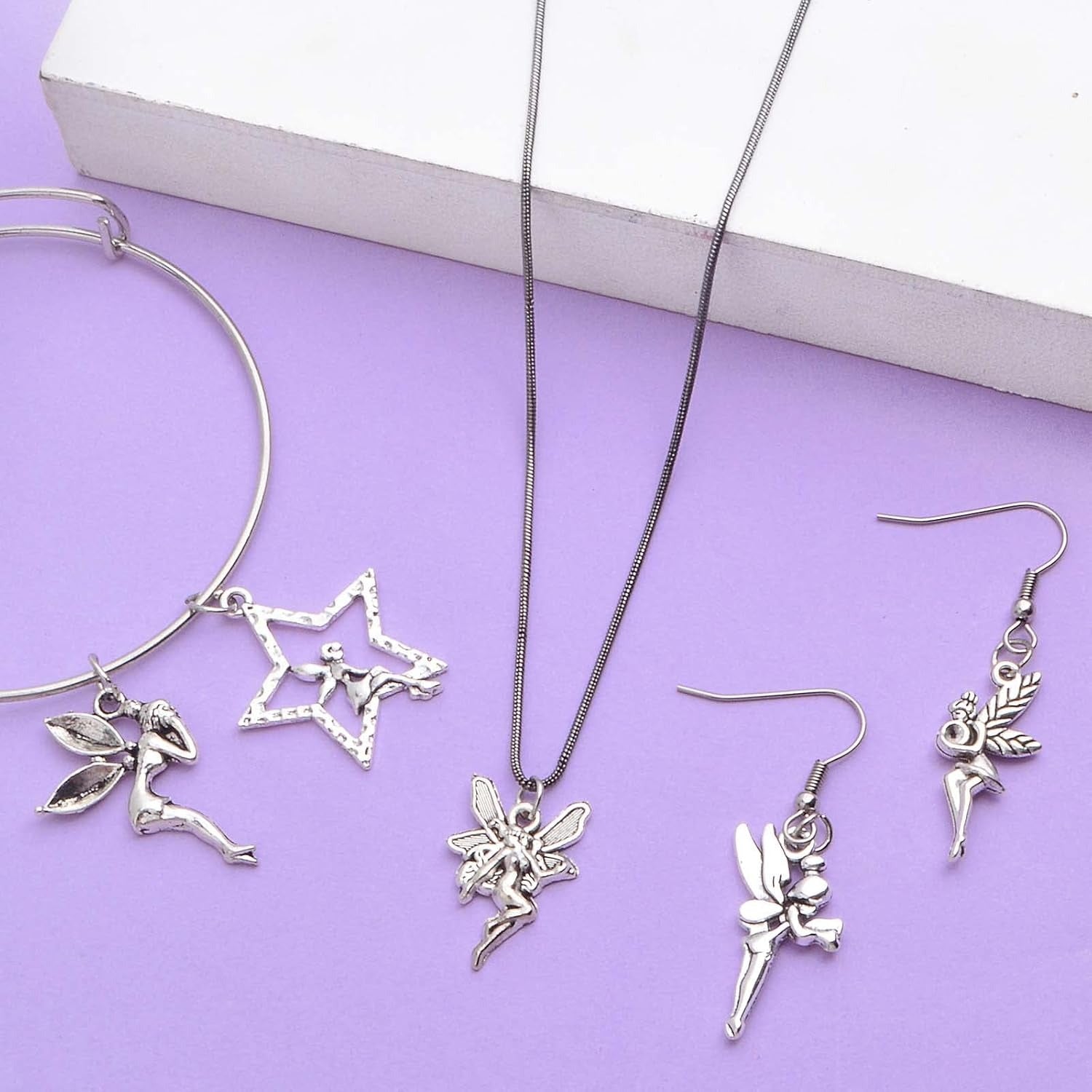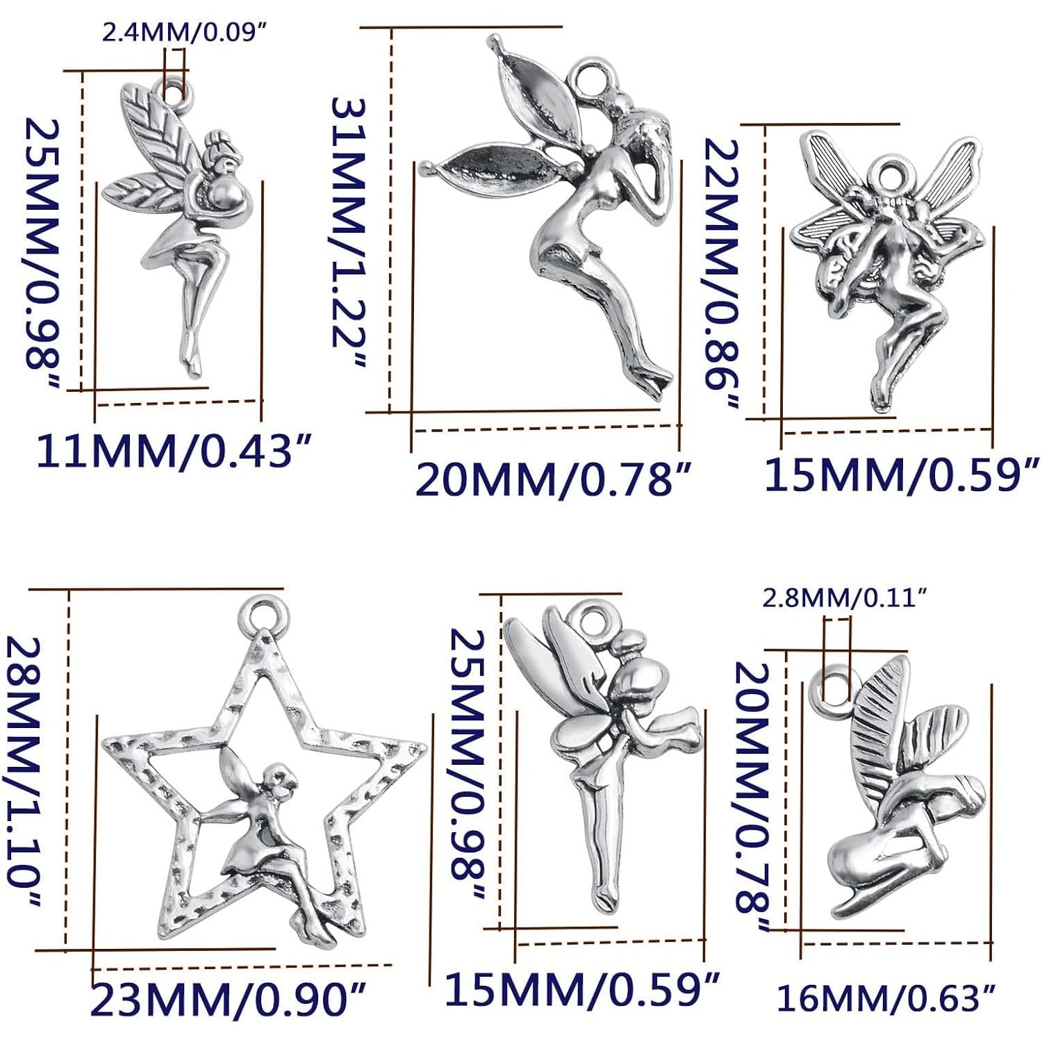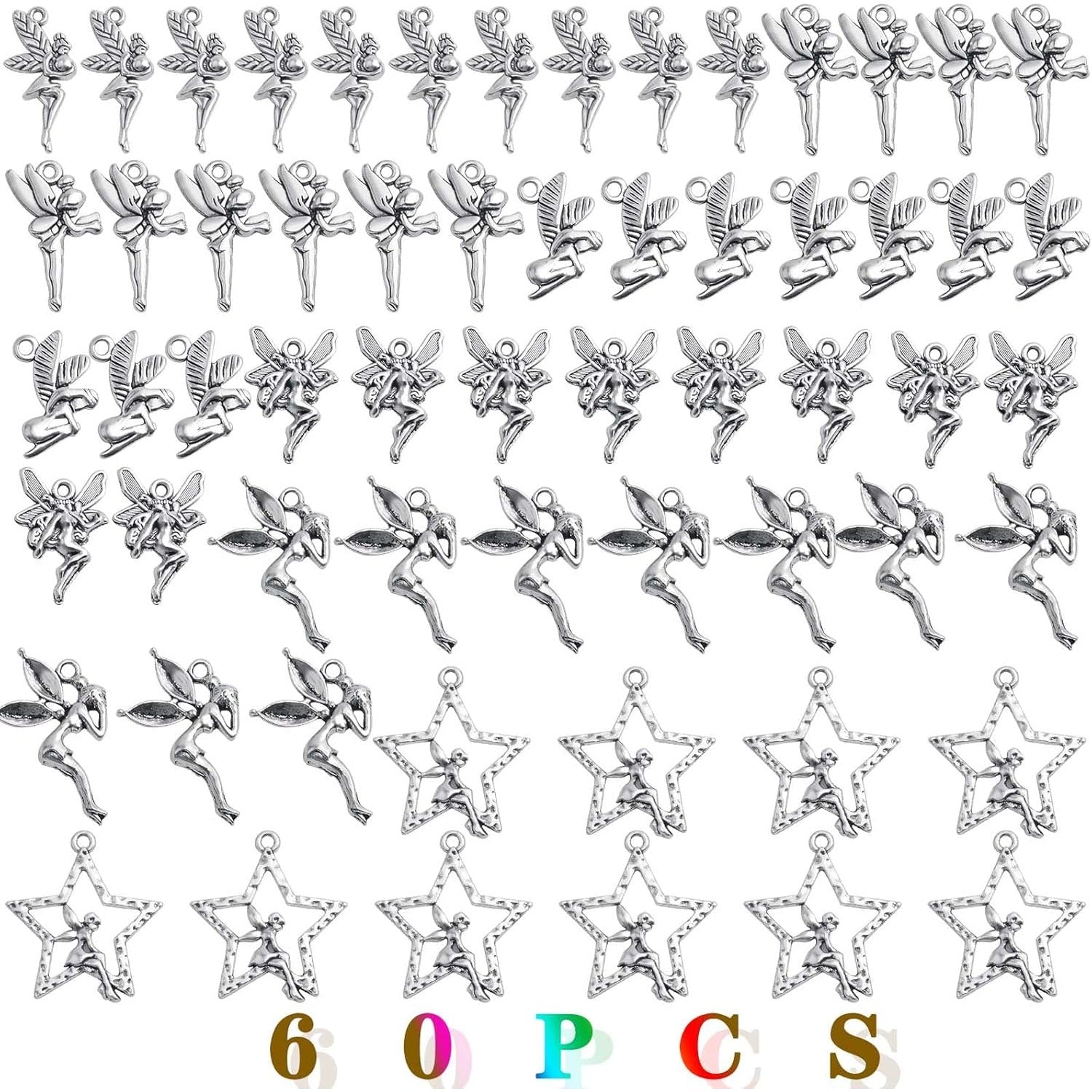 60pcs Antique Silver Angel Charms Vintage Alloy Fairy on Star Pendants Angel Fairy Dangle Charms Crafts Supplies for DIY Necklace Bracelet Earrings Jewelry Making, 6 Styles