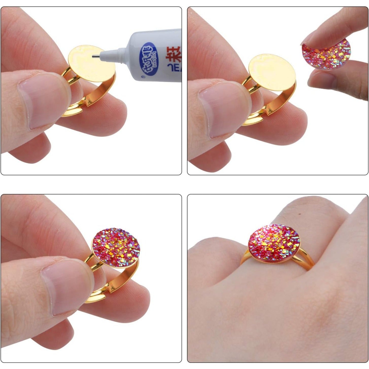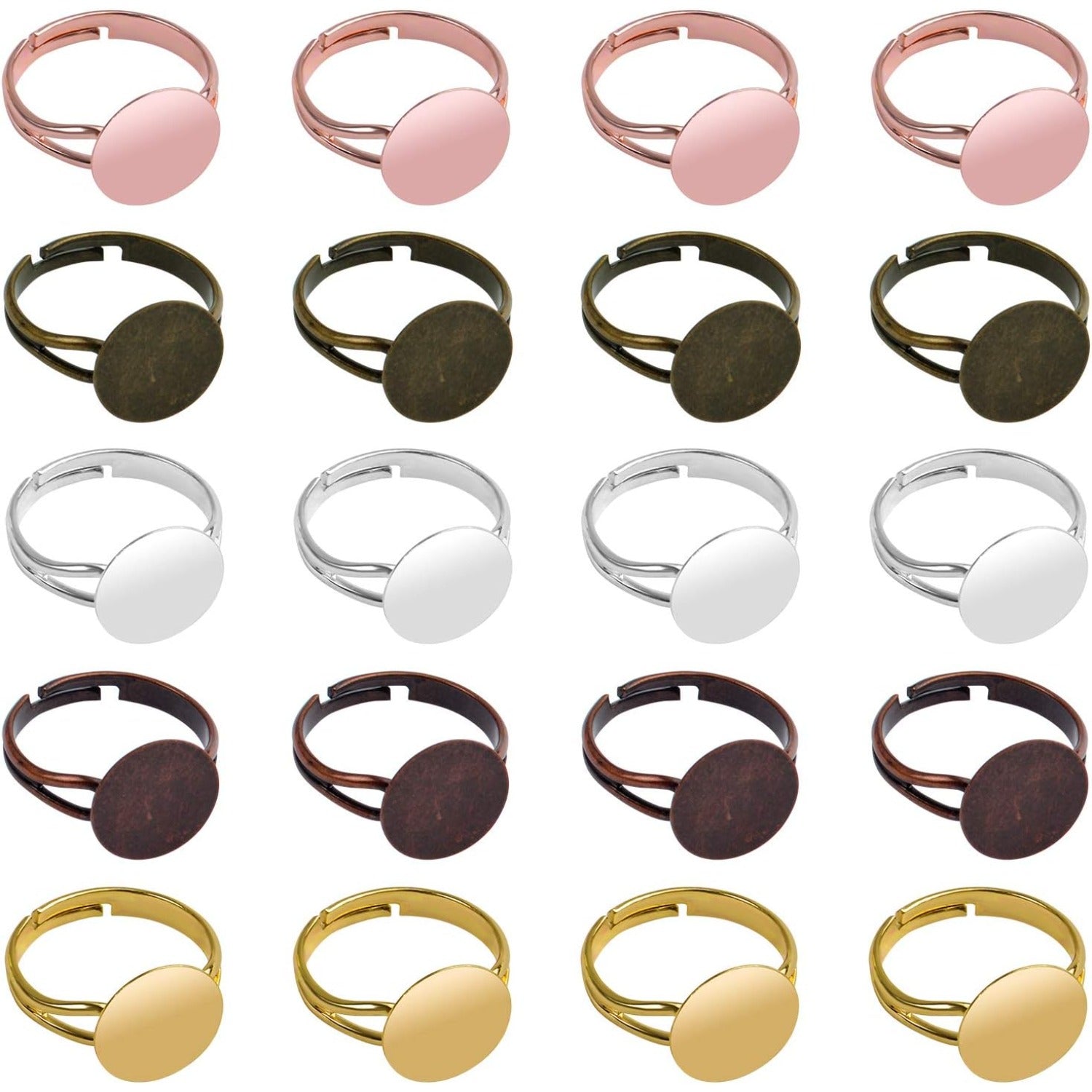 Specification Material: alloy Color: Silver, rose gold, gold, ancient red, ancient cyan Size: 12mm Quantity: 20pcs Feature Ajustable Diameter: These rings are adjustable to fit most ring sizes, so you don't have to worry about stocking up on multiple sizes. Easy to Use: Paste the lovely pattern with the clear glass cabochon, then cover the glass cabochons on the ring pendant tray, and then the unique finger ring is finished. Package Content 20 * Blank Rings with Flat Base