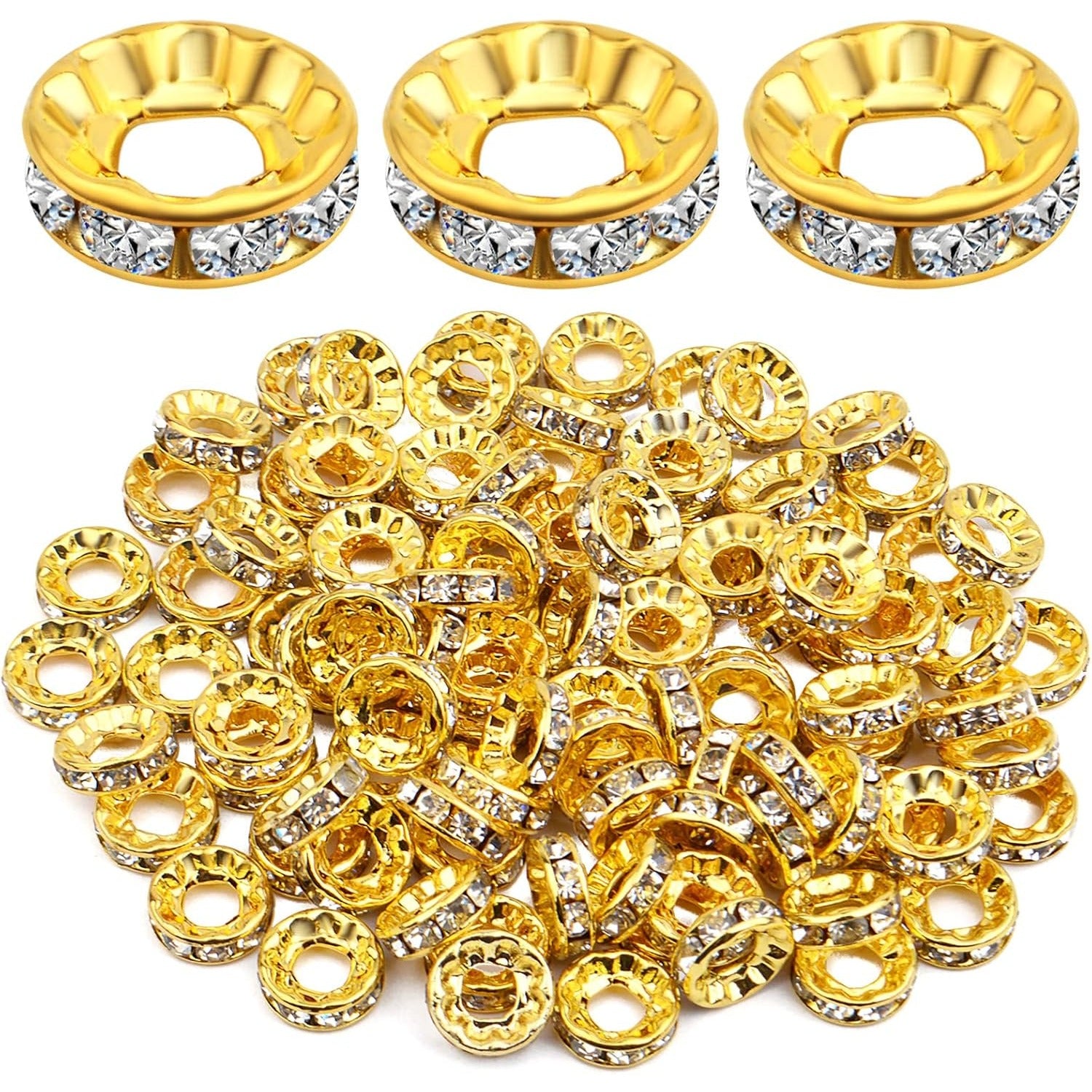 100pcs 10 mm Golden Plated Rhinestone Spacer Beads Large Hole European Rondelle Beads Round Shiny Crystal Loose Beads for DIY Bracelet Necklace Jewelry Making