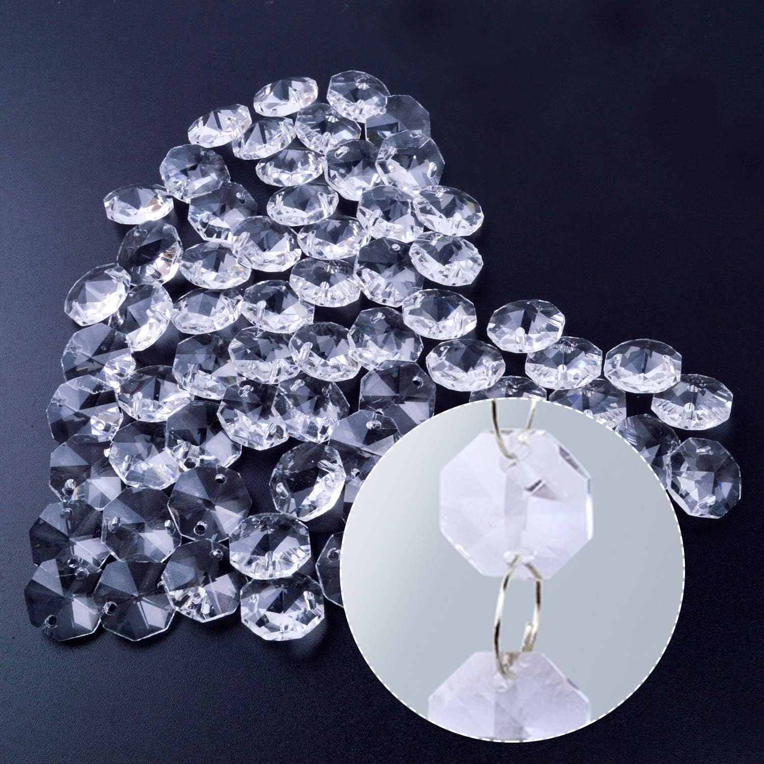 100Pcs 14mm Clear Crystal Octagon Beads with 100Pcs Stainless Curtain Rings Jump Rings Key Rings for Chandelier Prisms Curtain Parts Jewelry Making