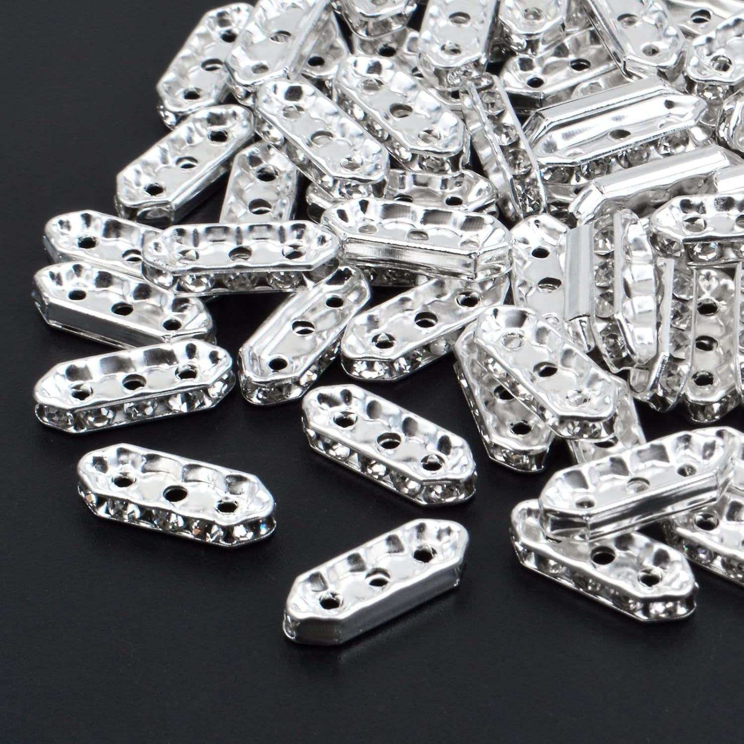 100pcs Silver Rhinestone Spacer Bars 3 Holes Crystal Spacer Beads Connector Loose Beads for DIY Multi Strand Bracelet Jewelry Making, 17.5x7mm