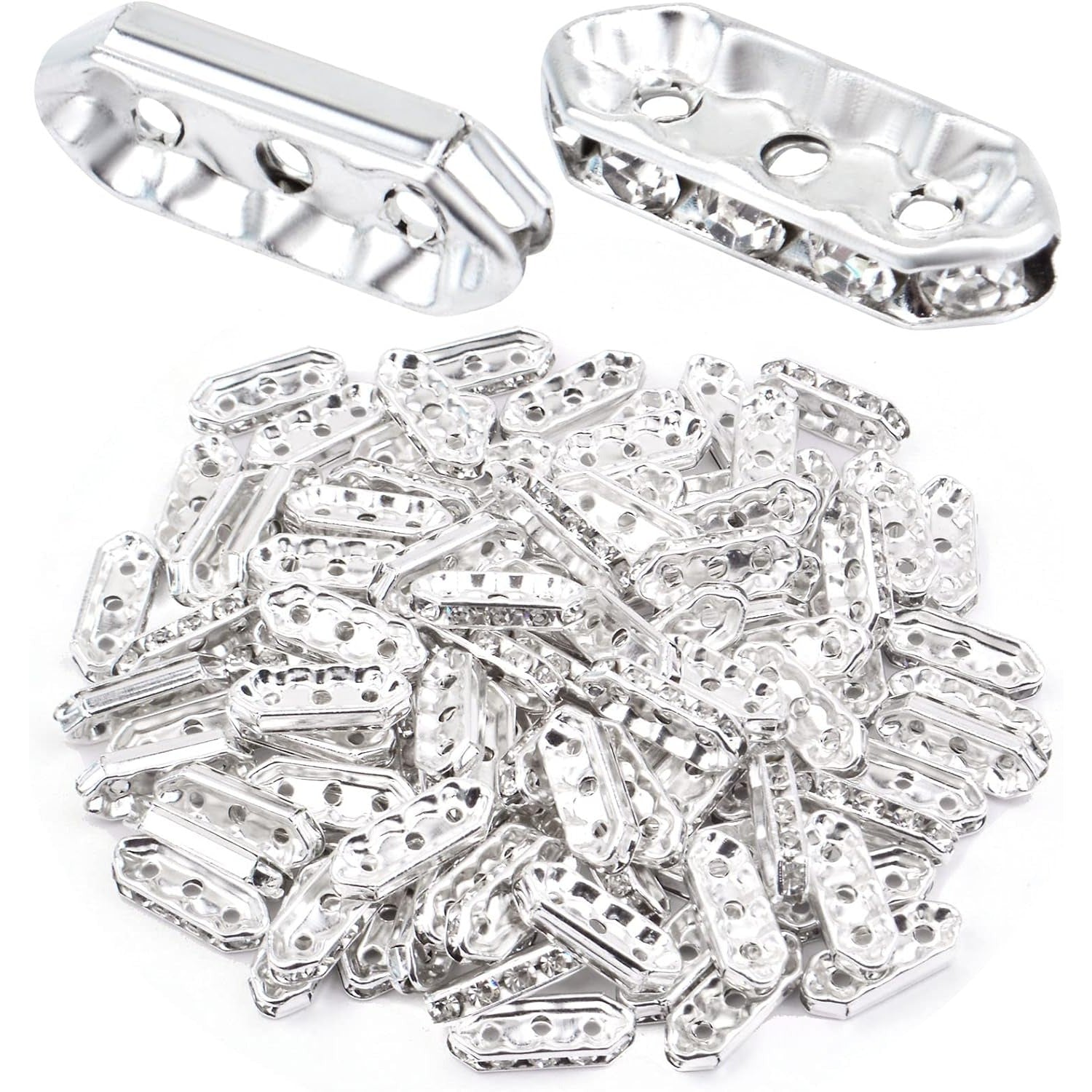 100pcs Silver Rhinestone Spacer Bars 3 Holes Crystal Spacer Beads Connector Loose Beads for DIY Multi Strand Bracelet Jewelry Making, 17.5x7m