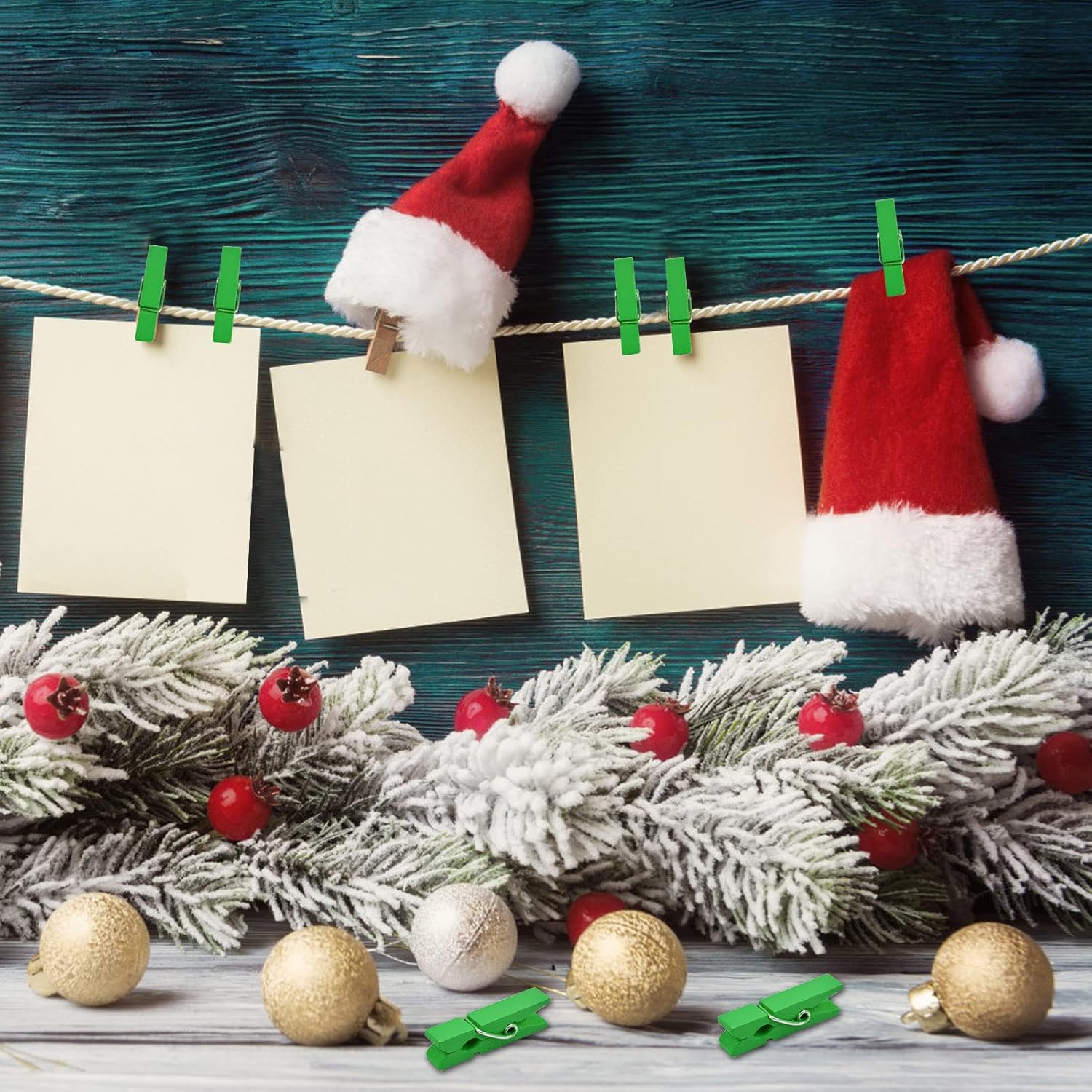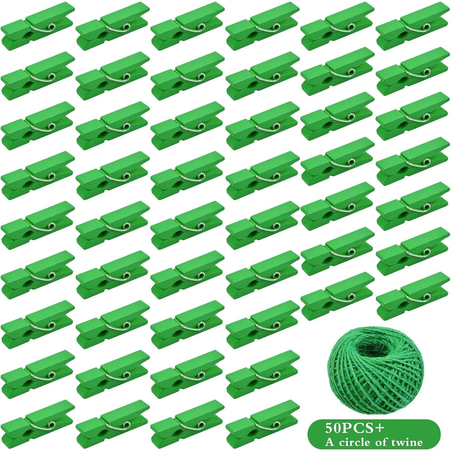 50pcs Small Wooden Clips Tiny Picture Photo Pegs Clothespins Decorative Craft Wood Clips with 50 M Jute Twine for Photo Display Picture Hanging Home Art Crafts Decor, Green