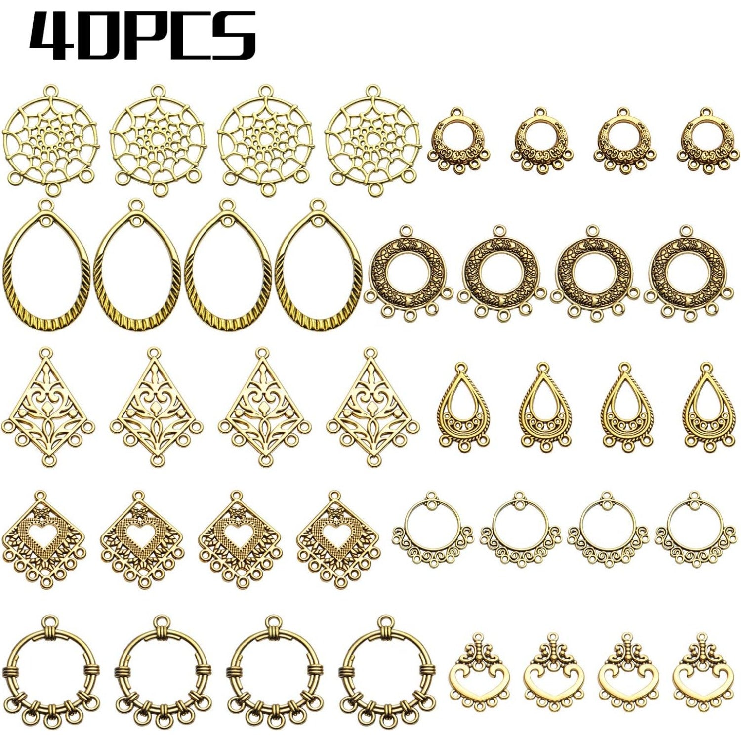 Earring Connectors, 40pcs 10 Styles Tibetan Bohemian Chandelier Charms Metal Embellishments for DIY Dangle Earring Drop Jewellery Making Kits, Antique Golden