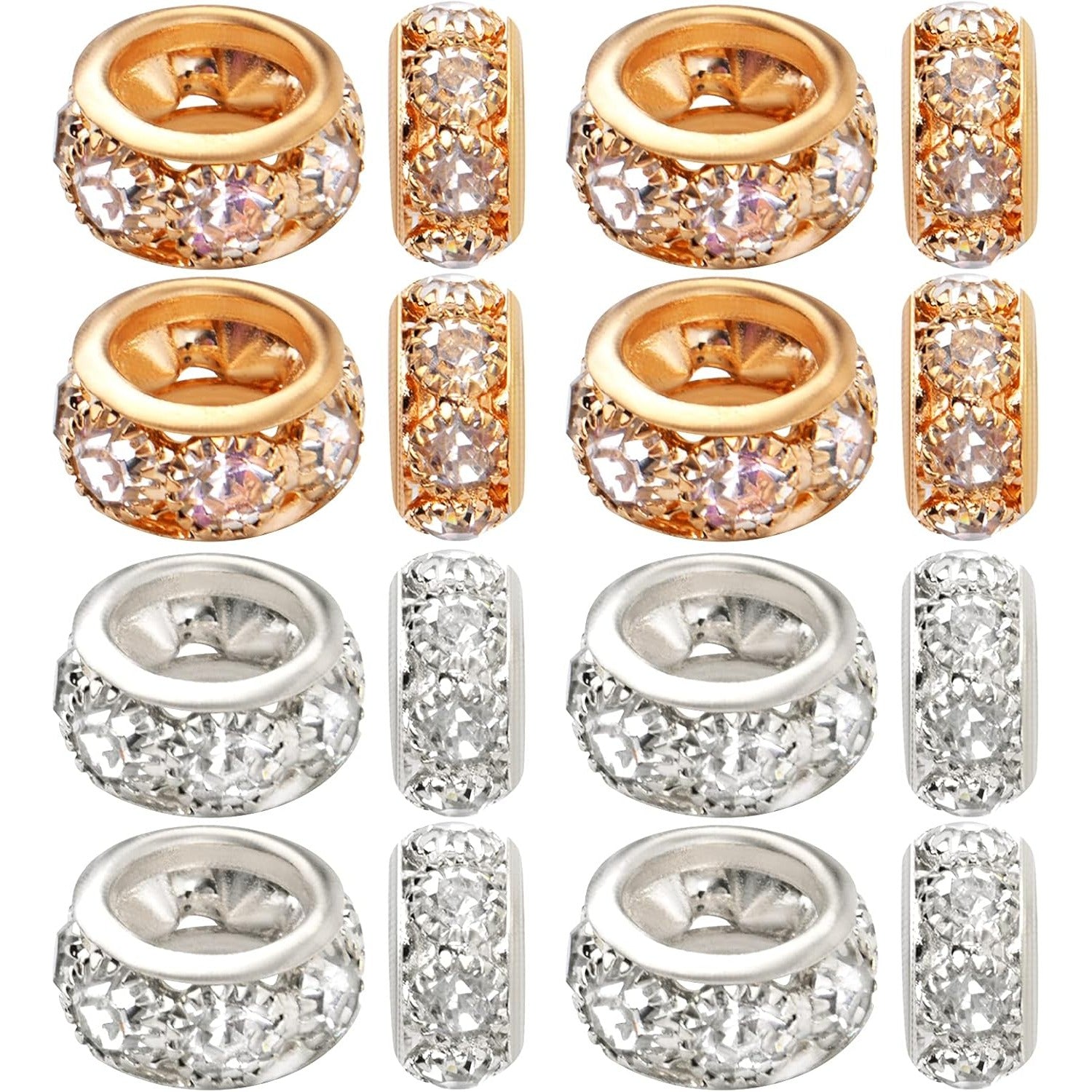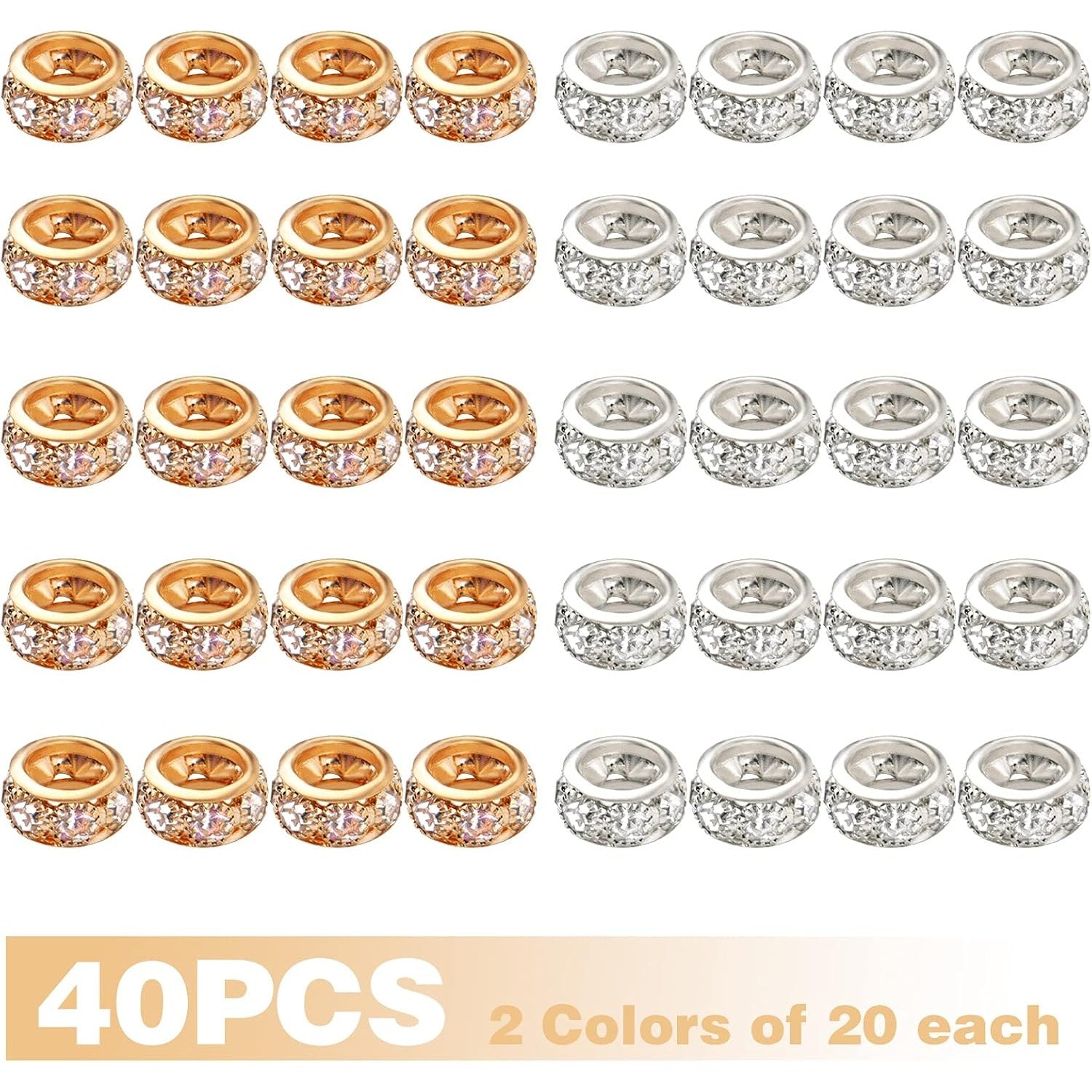 Large Hole Spacer Beads, 40pcs 12 mm Crystal Rhinestone European Beads Brass Rondelle Charm Spacers Loose Beads Crafts Supplies for DIY Snake Chain Bracelets Jewelry Making, Gold, Silver