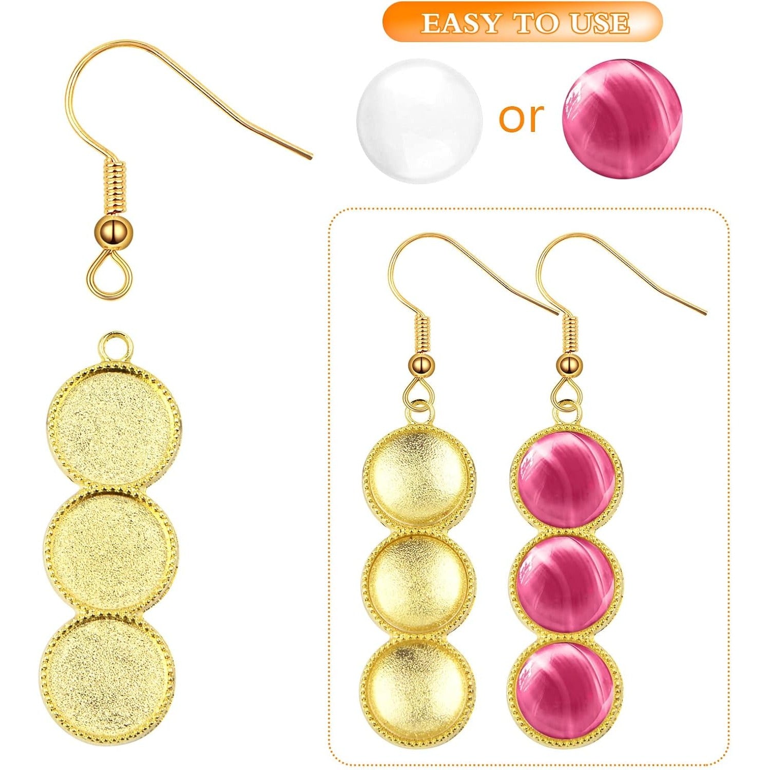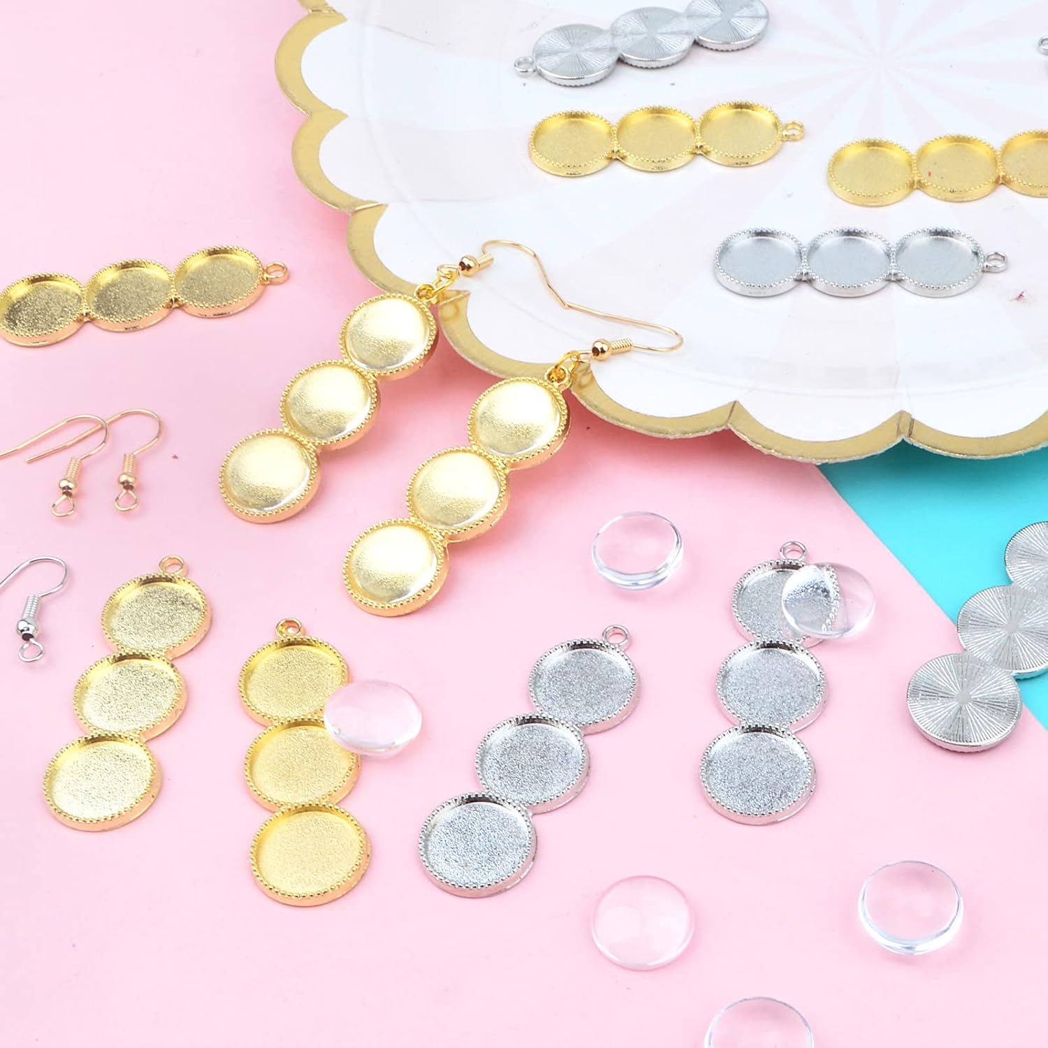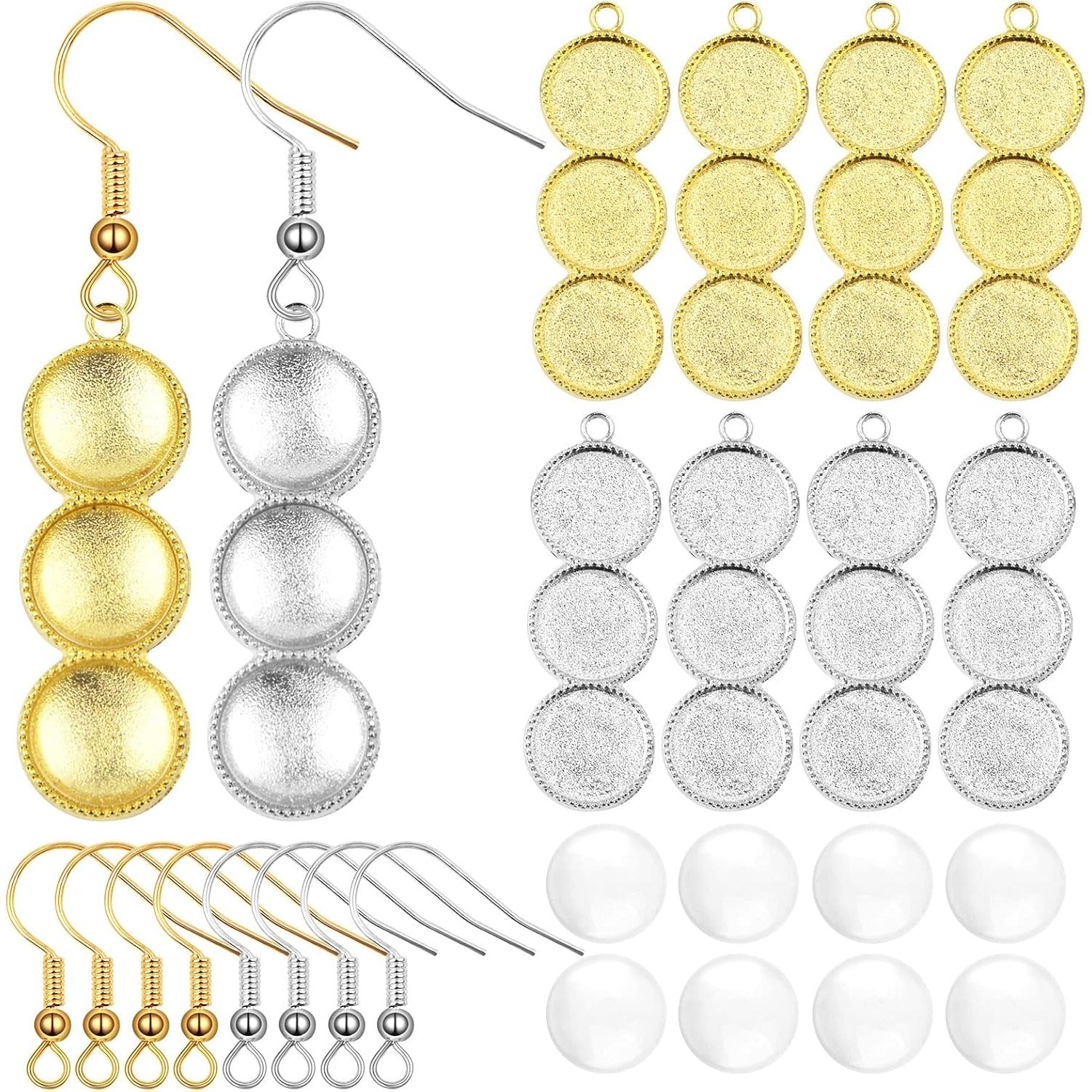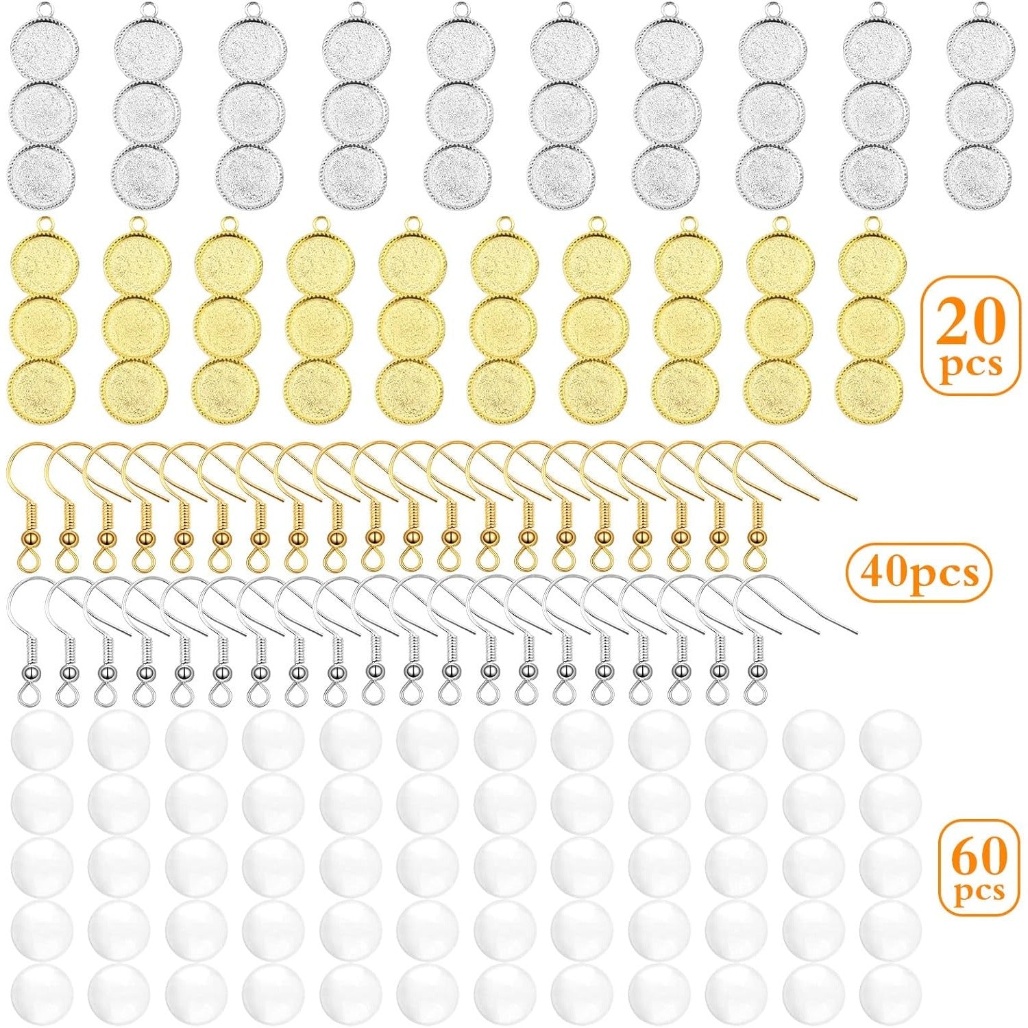 20pcs 2 Colors Blank Round 12 mm Earring Bezel Trays Bases 3-Consecutive Earring Blanks and 60pcs 12 mmGlass Cabochon Dome Tiles with 40pcs Earring Hooks for DIY Jewelry Making